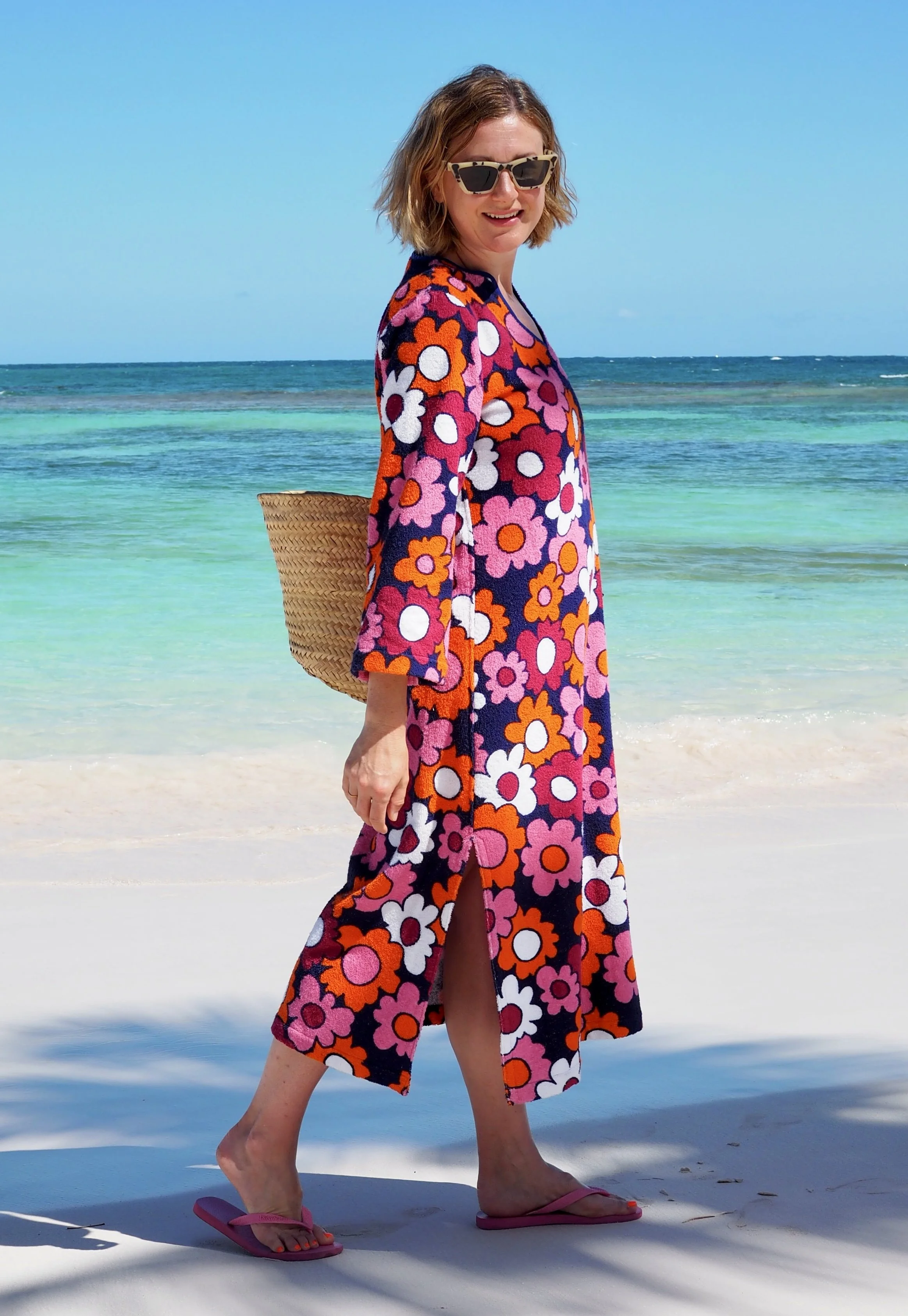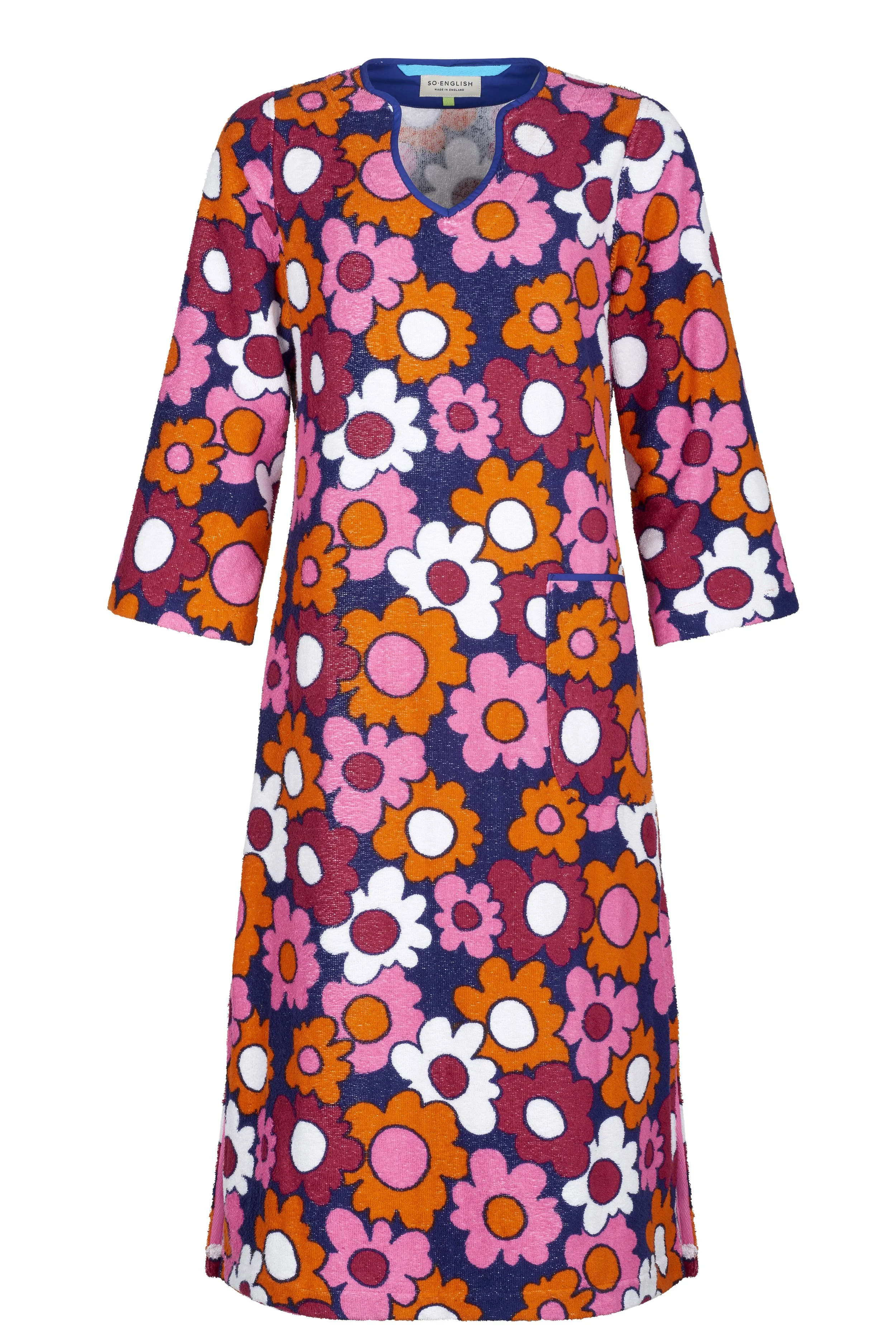 A slip-over-the-head style midi length dress with a flattering kaftan neckline. Contrast binding and ¾ length bell shaped sleeves. Retro floral screen printed Italian towelling.