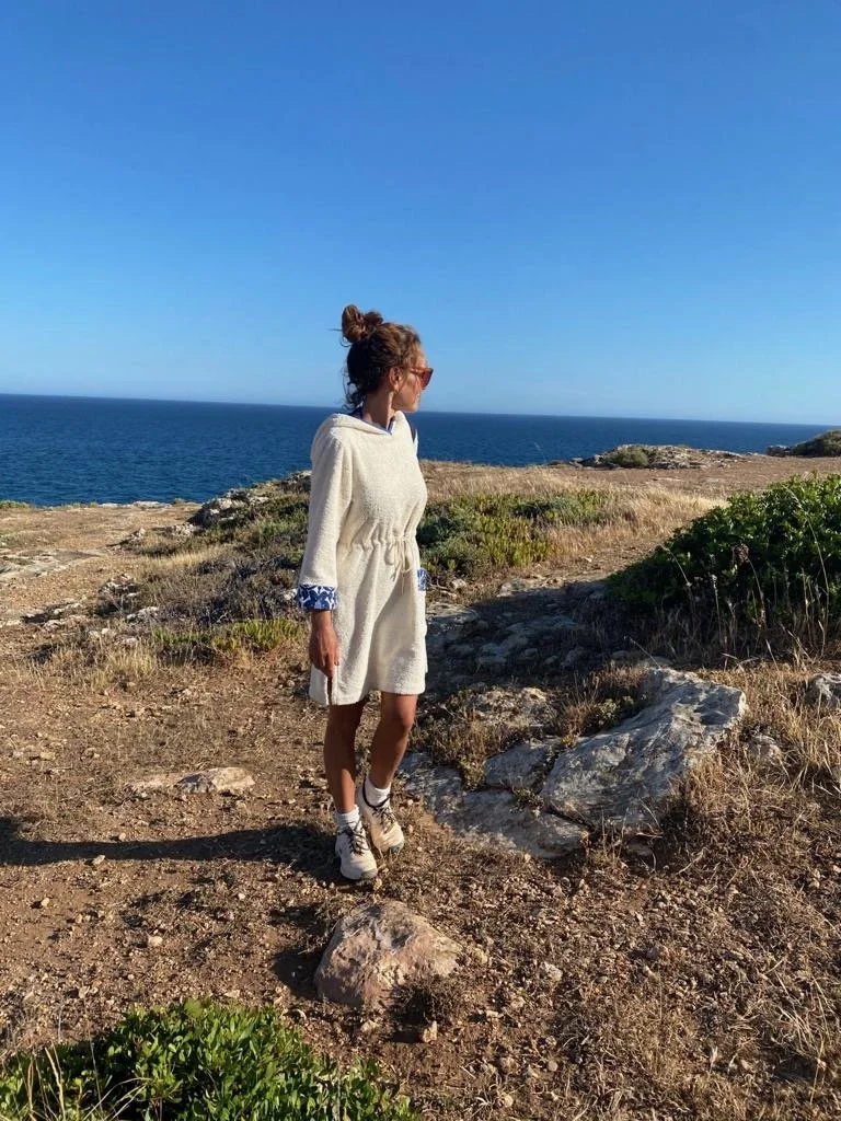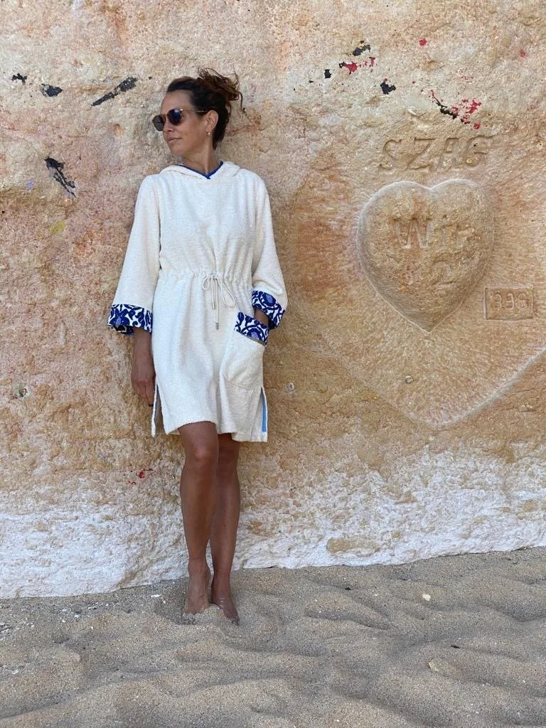 Drawstring waist to give a little more shape and soft styled hood. Made in a lighter weight, soft Italian towelling (310gm). Vintage inspired print on the pocket, makes this your go-to beach dress.